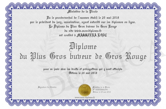 Envoyez par email votre Diplôme du Plus Gros buveur de Gros Rouge personalisé