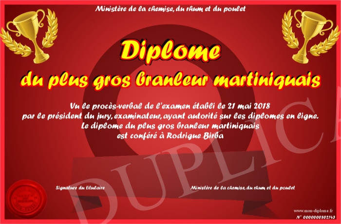 Envoyez par email votre Diplôme du plus gros branleur martiniquais personalisé