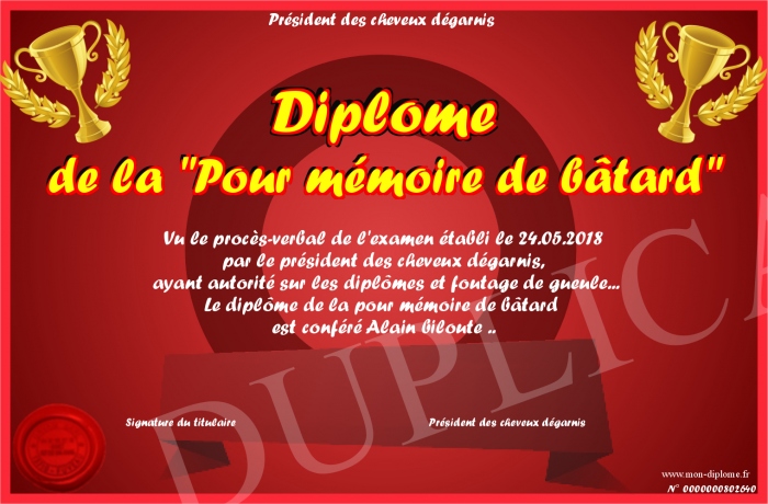 Envoyez par email votre Diplôme de la -Pour mémoire de bâtard- personalisé