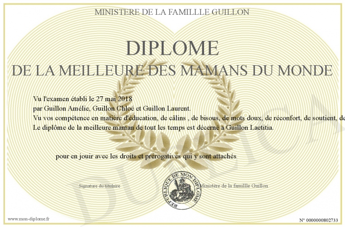 Envoyez par email votre Diplôme de la meilleure des mamans du monde personalisé