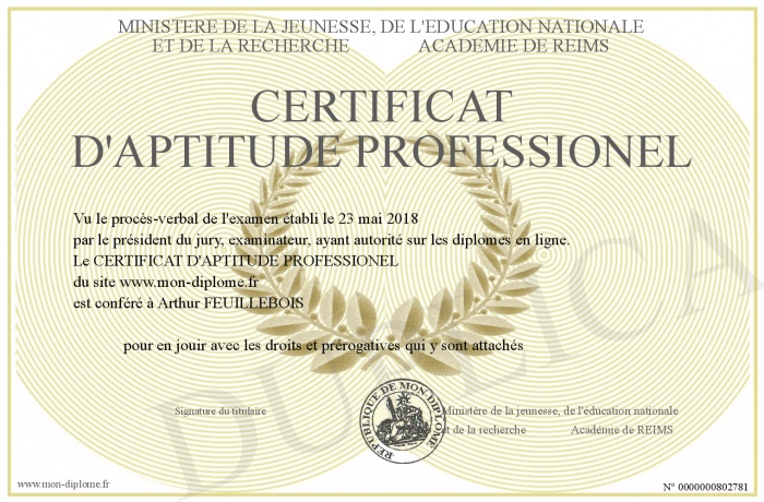 Envoyez par email votre CERTIFICAT D'APTITUDE PROFESSIONEL personalisé