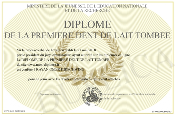 Envoyez par email votre DiPLOME DE LA PREMIERE DENT DE LAIT TOMBEE personalisé