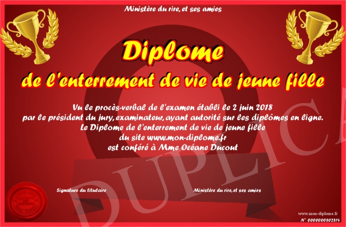 Envoyez par email votre Diplome de l'enterrement de vie de jeune fille personalisé