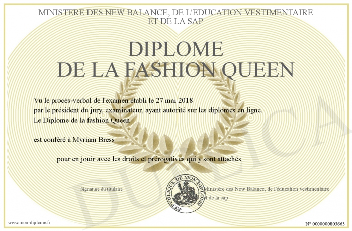 Envoyez par email votre Diplôme de la fashion Queen personalisé