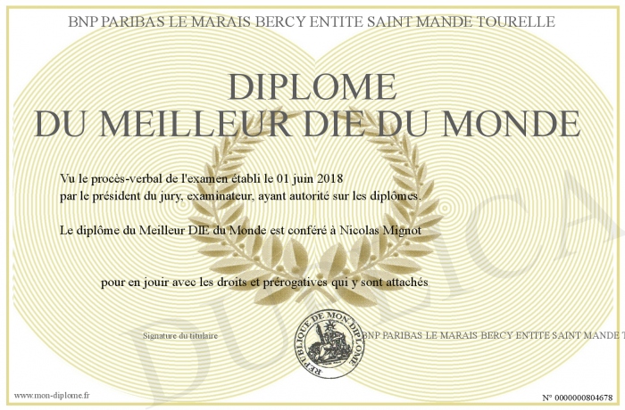 Envoyez par email votre Diplôme du meilleur DIE du Monde personalisé