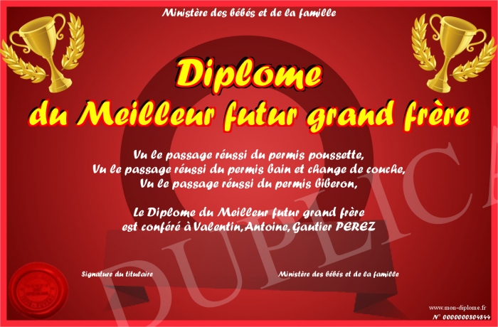 Envoyez par email votre Diplôme du Meilleur futur grand frère personalisé