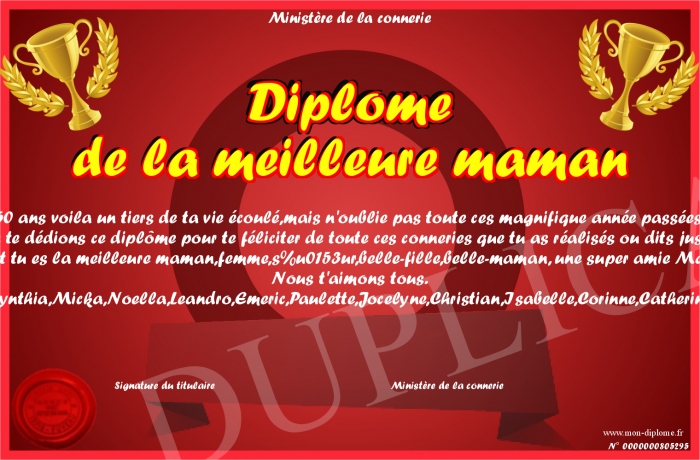 Envoyez par email votre Diplôme de la meilleure maman personalisé