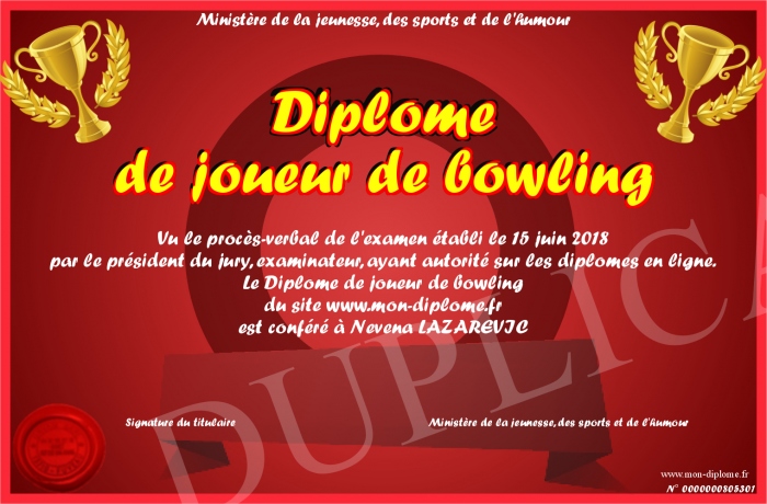 Envoyez par email votre Diplôme de joueur de bowling personalisé