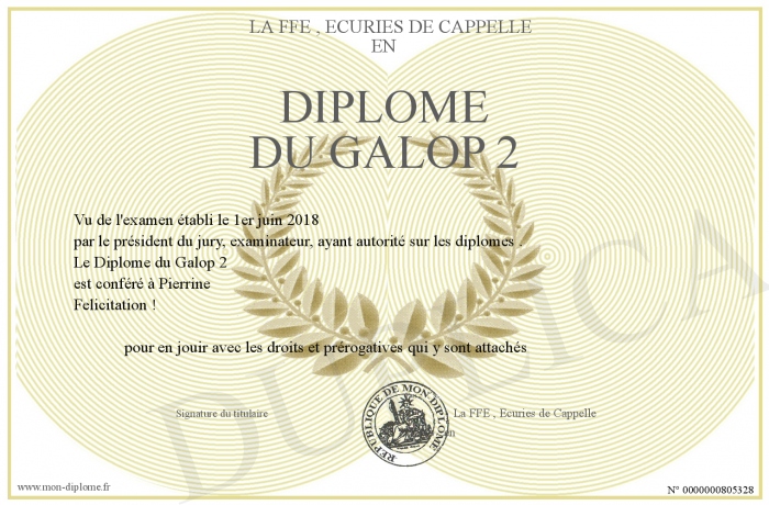 Envoyez par email votre Diplôme du Galop 2 personalisé