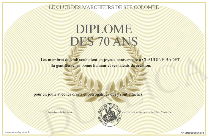 Envoyez par email votre DIPLOME DES 70 ANS personalisé