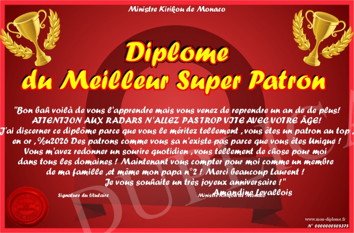 Envoyez par email votre Diplôme du Meilleur Super Patron personalisé
