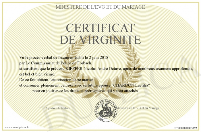 Envoyez par email votre CERTIFICAT DE VIRGINITE personalisé
