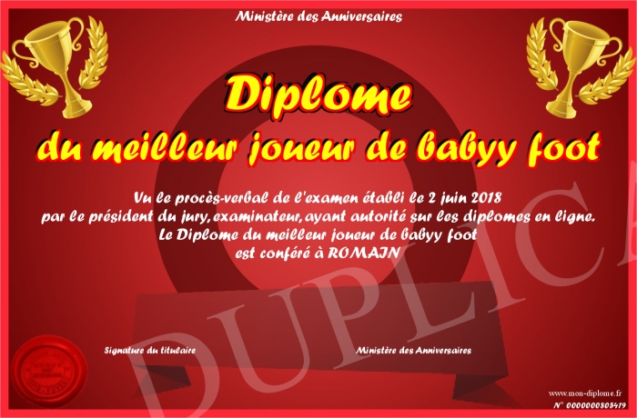 Envoyez par email votre Diplôme du meilleur joueur de babyy foot personalisé
