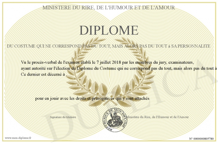 Envoyez par email votre Diplôme du Costume qui ne correspond pas du tout, mais alors pas du tout à sa personnalité personalisé