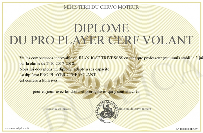 Envoyez par email votre DIPLOME DU PRO PLAYER CERF VOLANT personalisé