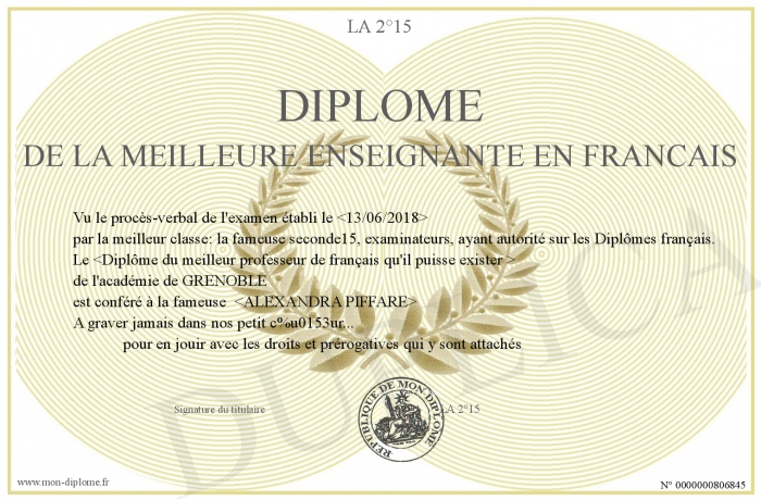 Envoyez par email votre Diplôme de la meilleure enseignante en FRANCAIS personalisé