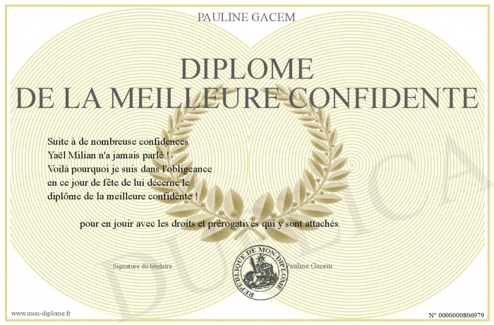 Envoyez par email votre Diplome de la meilleure confidente personalisé