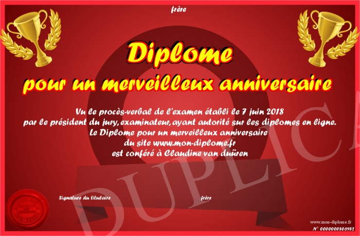 Envoyez par email votre Diplôme pour un merveilleux anniversaire personalisé
