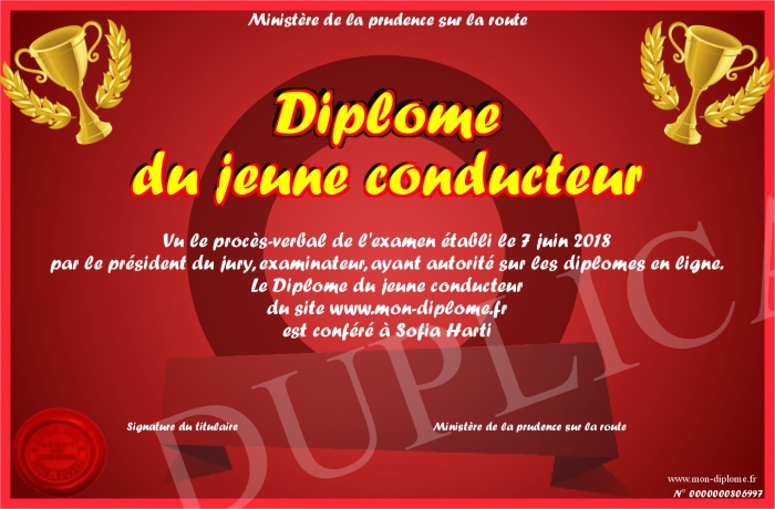 Envoyez par email votre Diplôme du jeune conducteur personalisé