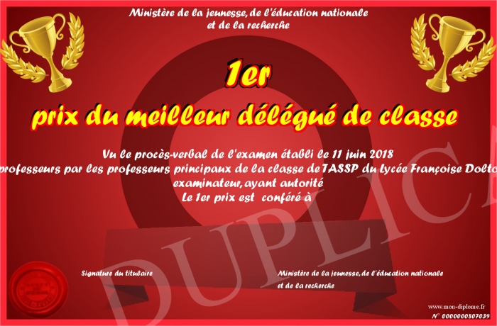 Envoyez par email votre 1er prix du meilleur délégué de classe personalisé