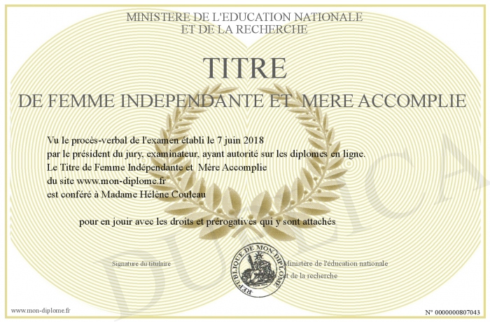 Envoyez par email votre Titre de Femme Indépendante et Mère Accomplie personalisé