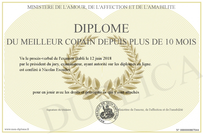 Envoyez par email votre Diplôme du meilleur copain depuis plus de 10 mois personalisé