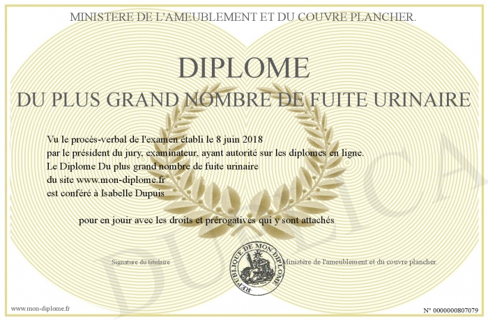 Envoyez par email votre Diplôme Du plus grand nombre de fuite urinaire personalisé