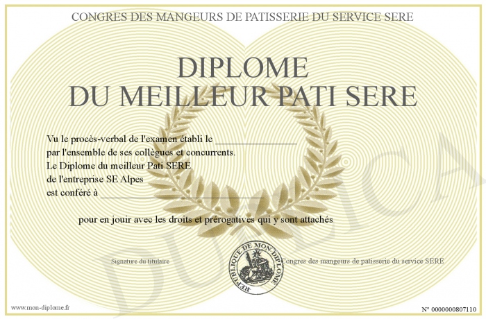Envoyez par email votre Diplome du meilleur Pati SERE personalisé