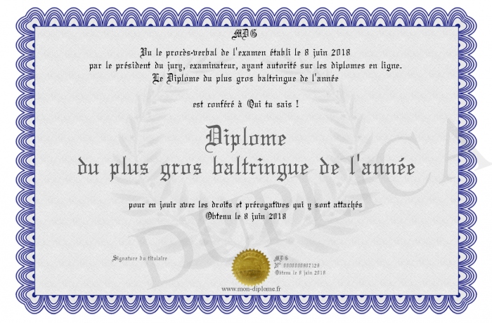 Envoyez par email votre Diplôme du plus gros baltringue de l'année personalisé