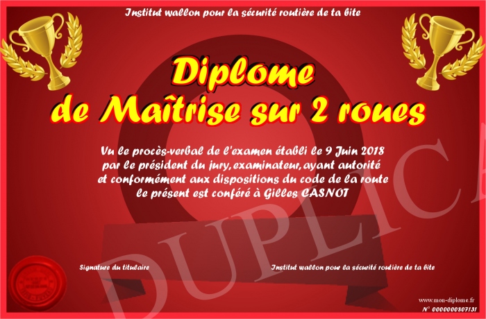 Envoyez par email votre Diplôme de Maîtrise sur 2 roues personalisé