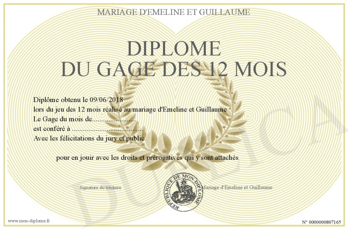 Envoyez par email votre Diplôme du Gage des 12 mois personalisé