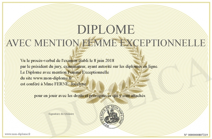 Envoyez par email votre Diplôme avec mention Femme Exceptionnelle personalisé