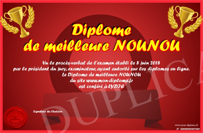 Envoyez par email votre Diplôme de meilleure NOUNOU personalisé