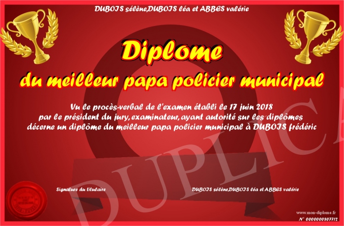 Envoyez par email votre Diplôme du meilleur papa policier municipal personalisé