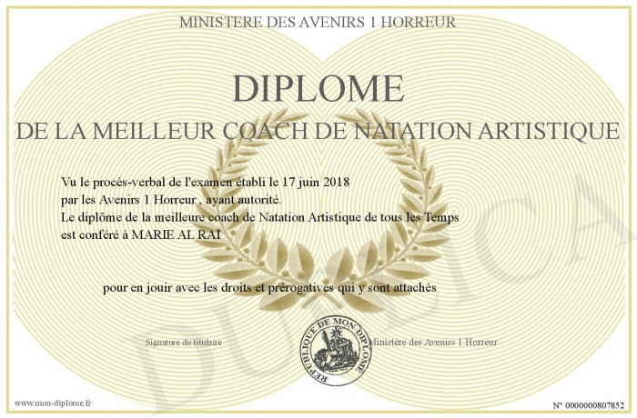 Envoyez par email votre Diplôme de la meilleur coach de natation artistique personalisé