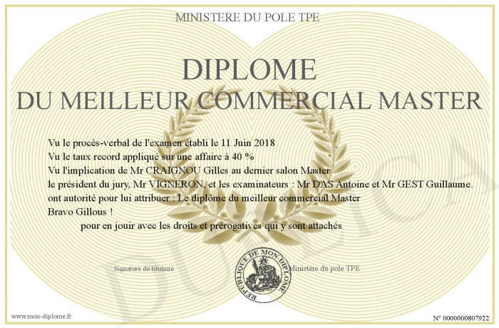 Envoyez par email votre Diplôme du meilleur commercial Master personalisé