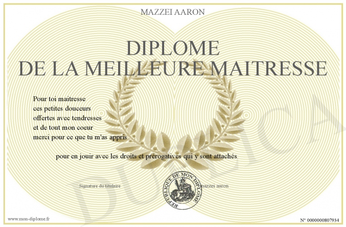 Envoyez par email votre Diplome de la meilleure Maitresse personalisé