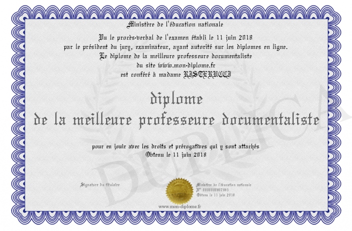 Envoyez par email votre diplôme de la meilleure professeure documentaliste personalisé