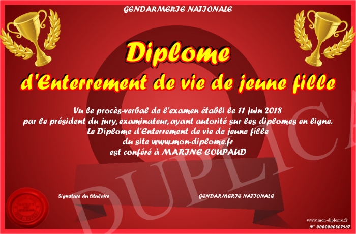 Envoyez par email votre Diplome d'Enterrement de vie de jeune fille personalisé