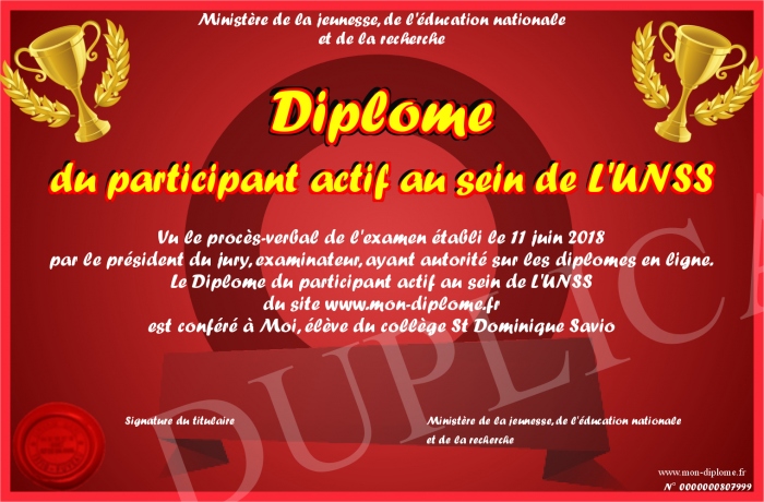 Envoyez par email votre Diplôme du participant actif au sein de L'UNSS personalisé