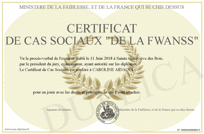 Envoyez par email votre CERTIFICAT DE CAS SOCIAUX -DE LA FWANSS- personalisé