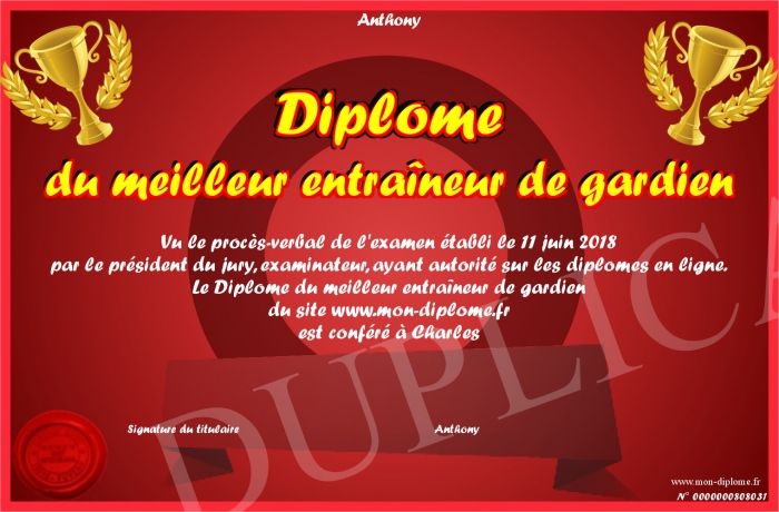 Envoyez par email votre Diplôme du meilleur entraîneur de gardien personalisé