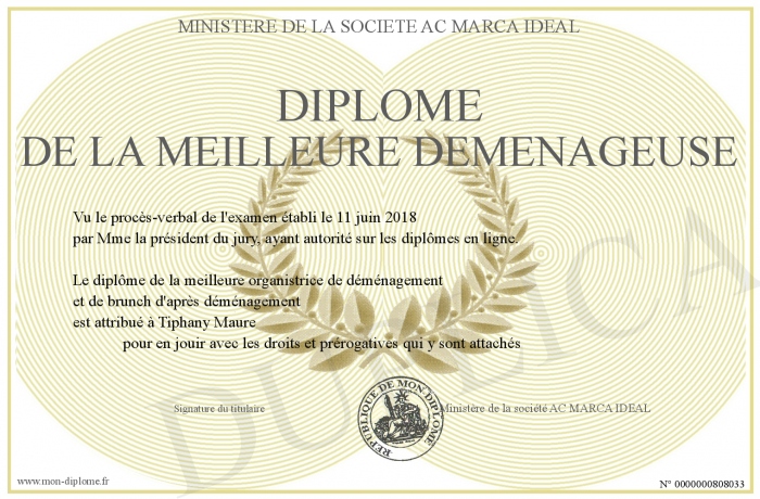 Envoyez par email votre Diplôme de la meilleure déménageuse personalisé