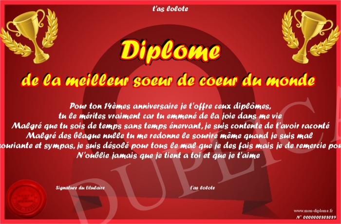 Envoyez par email votre Diplôme de la meilleur soeur de coeur du monde personalisé