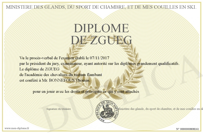 Envoyez par email votre Diplôme de ZGUEG personalisé