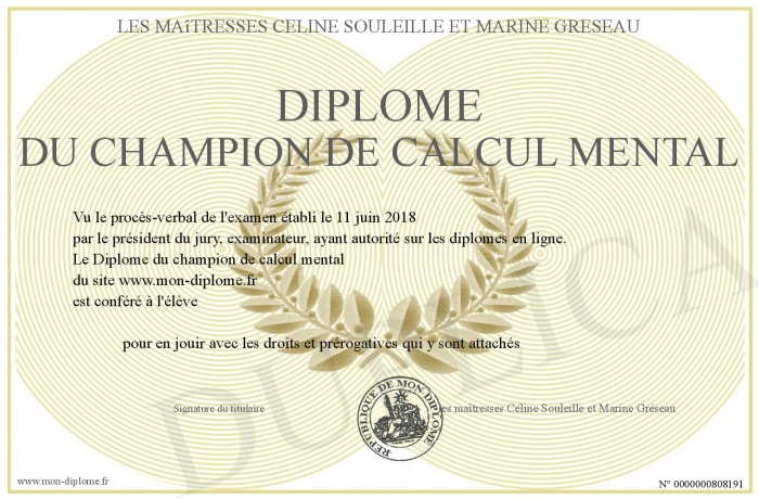 Envoyez par email votre Diplôme du champion de calcul mental personalisé