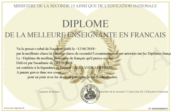 Envoyez par email votre Diplôme De LA MELLEURE ENSEIGNANTE EN FRANCAIS personalisé
