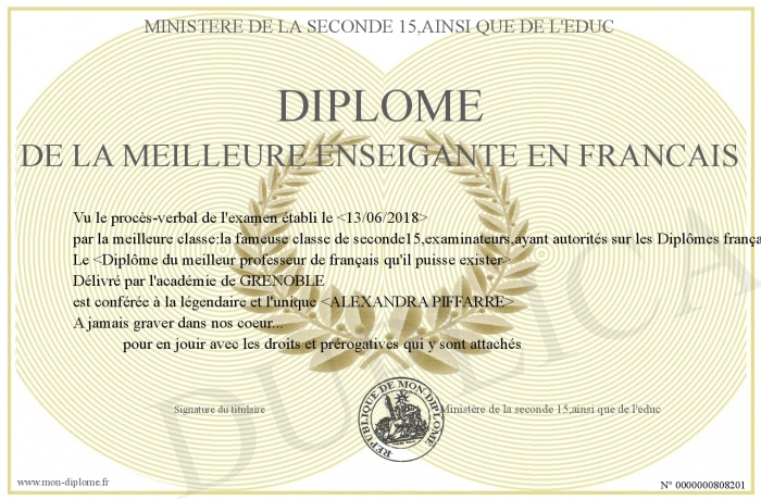 Envoyez par email votre Diplôme de la meilleure enseigante en francais personalisé