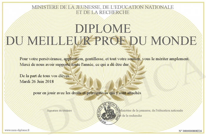 Envoyez par email votre Diplome du meilleur Prof du Monde personalisé