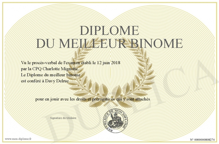 Envoyez par email votre Diplôme du meilleur binome personalisé